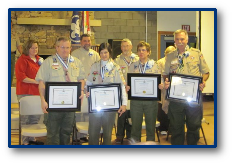 The March 12th Council Recognition Night drew over 100 people for dinner and a program at the Cub and Webelos Adventure Camp dining hall.  Rivers and Crater districts were recognized as Journey To Excellence Gold districts; Arrohattoc, Battlefield, Cardinal and Huguenot Trail districts were recognized with Silver and Capitol with Bronze.  All districts “medaled” with Journey To Excellence. The highlight of the evening was the presentation of the Silver Beaver Awards.  Pictured above are Bob Parker, Sue McCue, Shawn Coffey and Ed Beach.  Chris Habenicht will be presented his award at the June annual business meeting.  The award was also presented at an earlier time to Chris Sherman and post-humously to Bill Givler III.